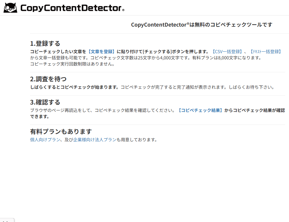 ・インターネット上の膨大なテキストデータベースと照合して、入力されたテキストとの一致率を算出 ・一致したテキストの箇所や一致率、該当するウェブサイトのURLなどを表示 |