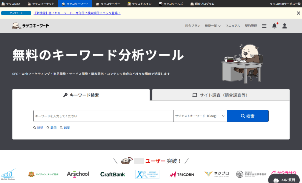 ラッコキーワードは、Webコンテンツ制作やSEO対策に役立つキーワード調査ツールです。