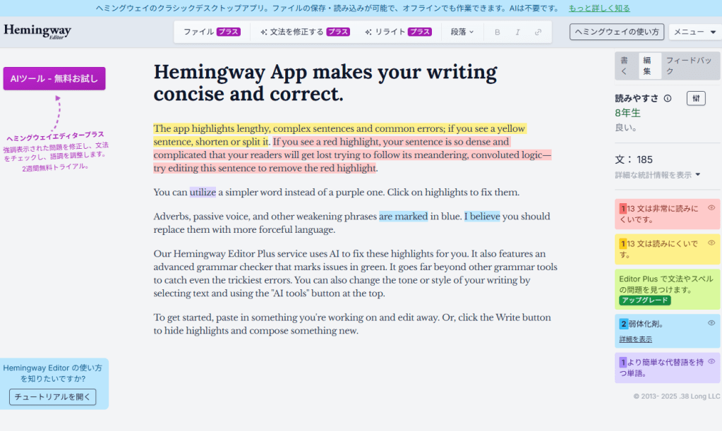 このエディターは、アーネスト・ヘミングウェイの簡潔な文体にちなんで名付けられ、複雑な文章や冗長な表現を特定し、より直接的で力強い文章に修正するサポートを行います。