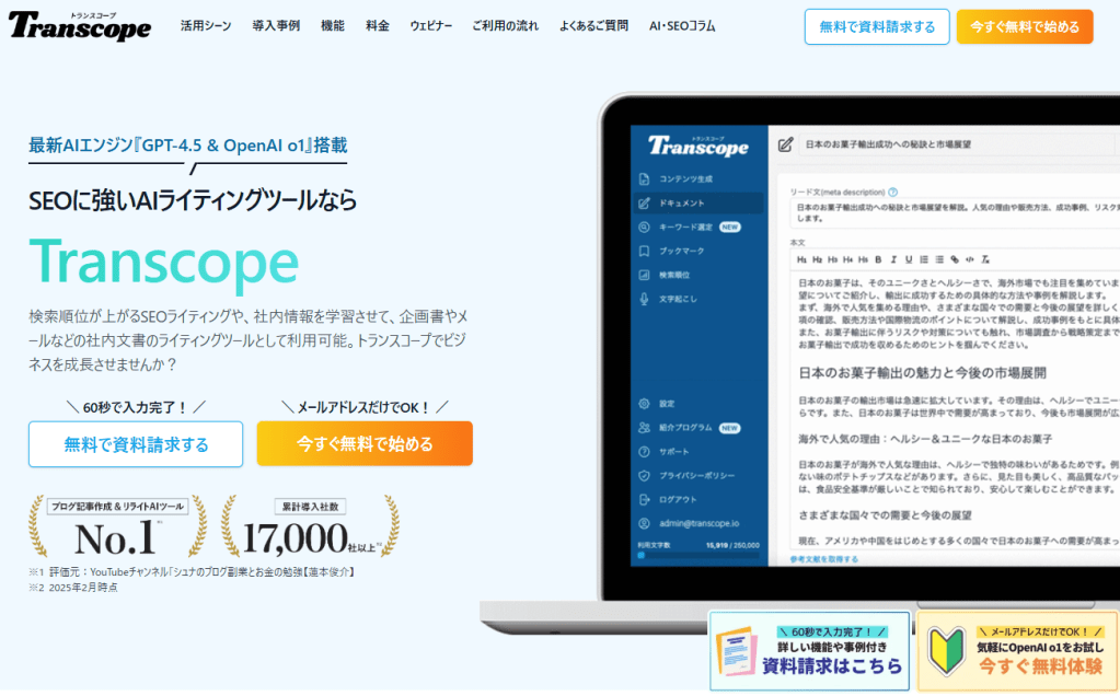Transcopeは、多岐にわたるコンテンツ生成を可能にした、AIを活用した文章作成ツールです。
