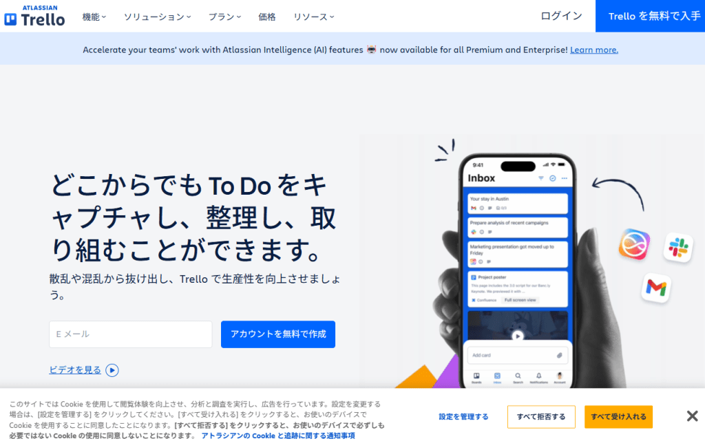 Trelloは、「ボード」「リスト」「カード」という要素を使った、カンバン方式を採用して視覚的にタスク管理ができるコラボレーションツールです。