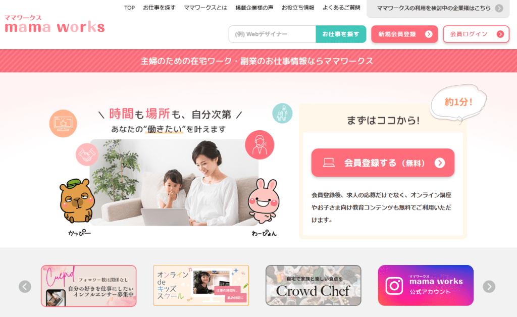 ママワークスは、主婦やママ層に特化した在宅ワーク求人サイトです。 ママワークスのWebライター求人には、主婦やママ層が自宅で子育てや家事と両立しながら働きやすい案件が多く見受けられます。