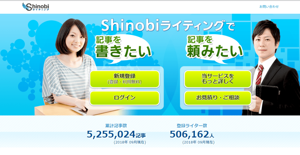 Shinobiライティングは、手軽に始めやすいWebライティングの求人サイトです。 タスク形式の案件数が豊富で、短時間で完了できる記事作成や口コミ投稿などが多数掲載されています。