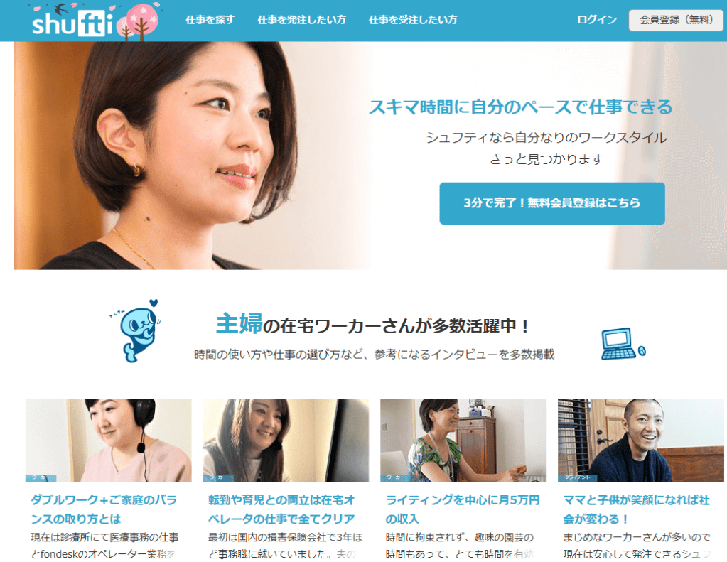 Shufti(シュフティ)は、主婦層を中心とした在宅ワークに特化した求人サイトです。 Webライターの求人に関しても、短時間でできるタスク形式の案件を多数掲載しており、初心者や未経験者でも比較的容易に始められる案件が見られます。