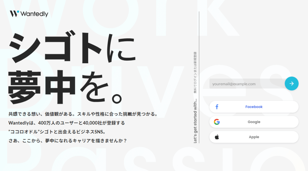 Wantedly(ウォンテッドリー)は、「共感」や「ストーリー」を軸としたビジネスSNSであり、従来の求人サイトとは異なるアプローチで企業と求職者を繋ぐプラットフォームです。 企業理念やビジョン、事業内容やチームの雰囲気などを詳細に伝え、それに共感した人材を求めます。