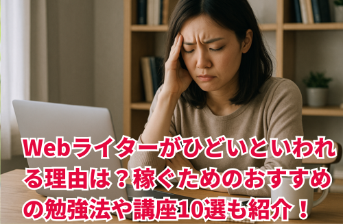 Webライターはパソコン1台で副業、本業を問わず、誰でも気軽に始められる人気の仕事ですが 「Webライターは稼げなくてひどい…」 といった声を耳にしたことがある人も多いのではないでしょうか? そこで今回は、Webライター … 続きを読む Webライターがひどいといわれる理由は?稼ぐためのおすすめの勉強法や講座10選も紹介!