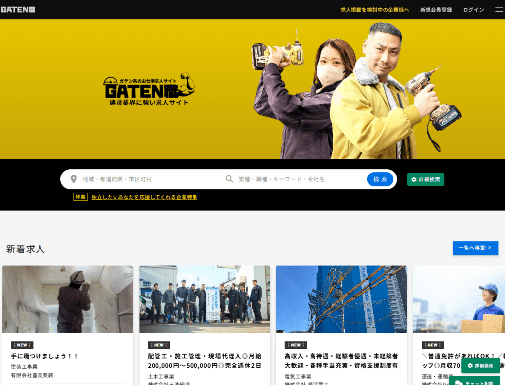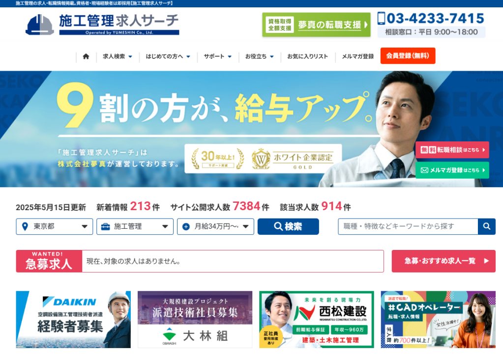 施工管理や現場作業員などの職種を中心に、全国で約9,000件以上の求人情報を掲載しています 。