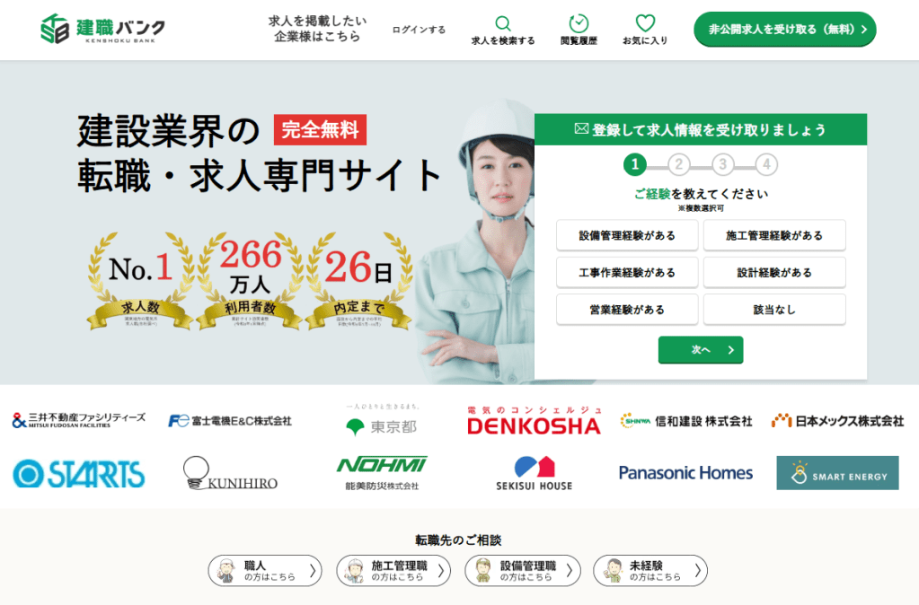 建職バンクは建設業界に特化した転職支援サービスで、施工管理や電気工事士、現場作業員など多様な職種の求人を全国規模で掲載しています。