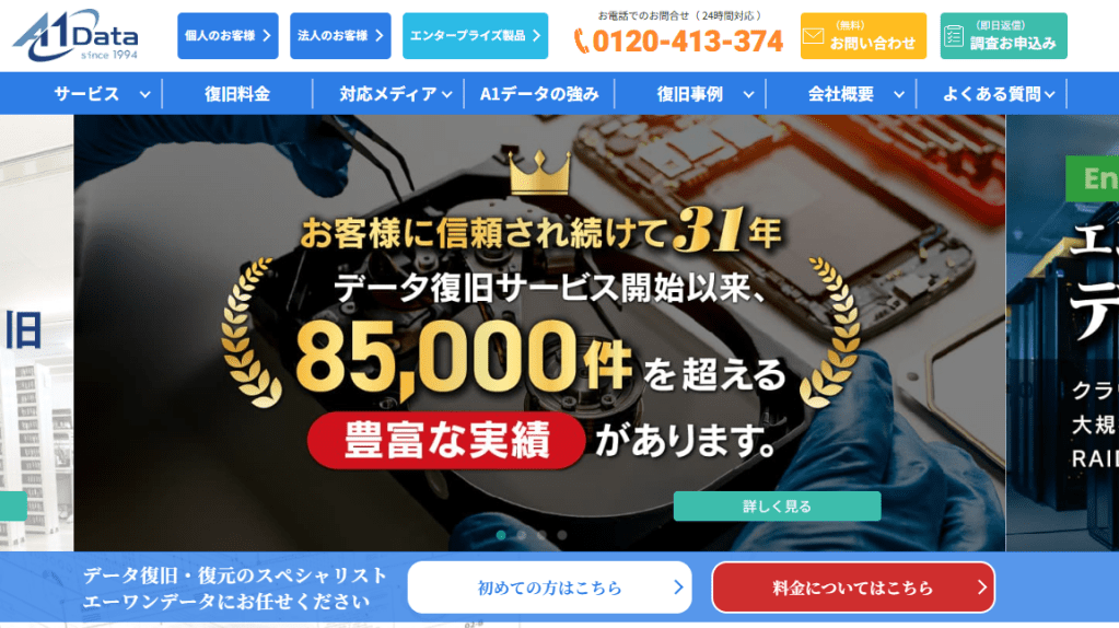 データ復旧に関しては、高い技術力を活用して他社でも困難な案件にも柔軟に対応可能で、調査費無料で完全成功報酬制を採用しているエーワンデータへの依頼がおすすめです。